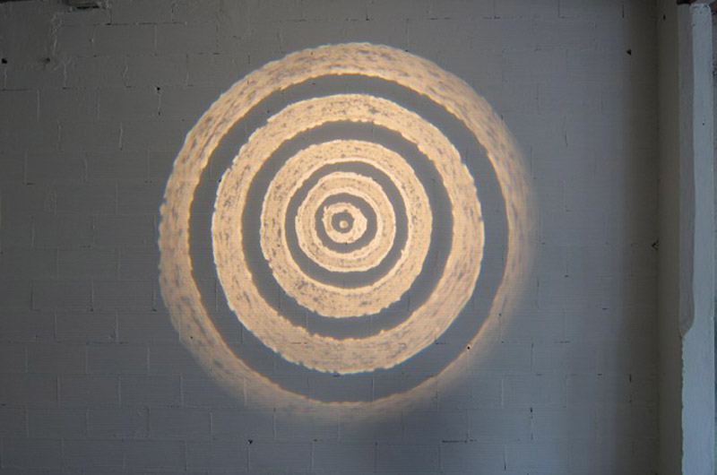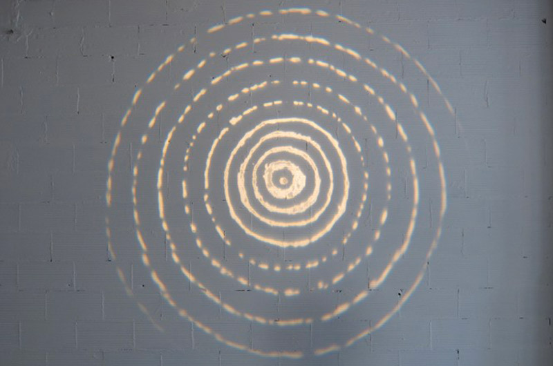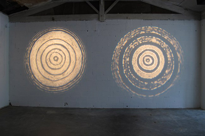 La série Diaphanies, commencée en 2012, fait interagir programmation lumineuse et aléas de la lumière du jour pour déployer dans la durée l’apparition/disparition des phénomènes.